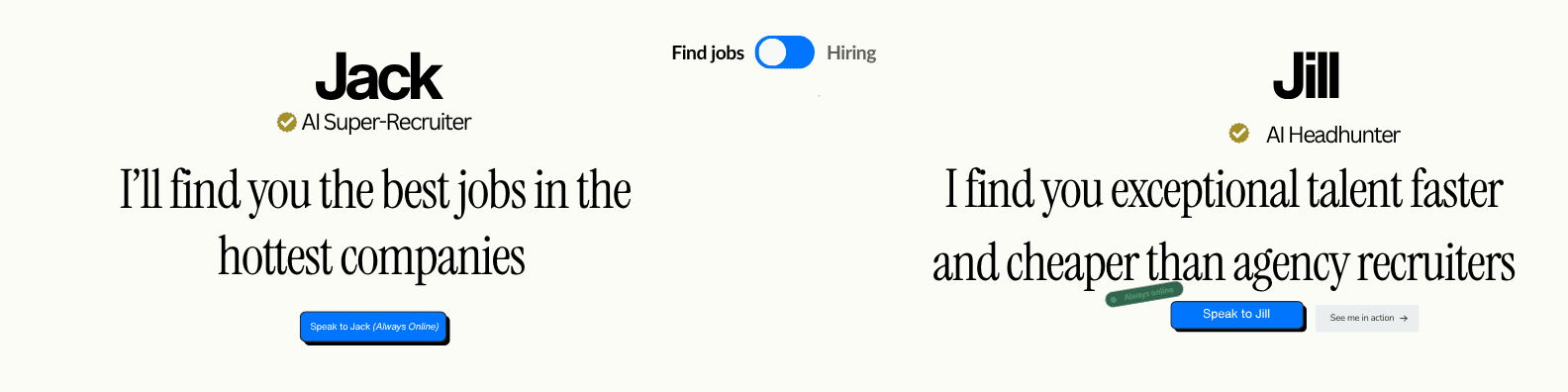 Your personal AI career agent. Jack and Jill finds you the unmissable jobs at hot startups and gets you straight to the interview, skipping the application black hole.
